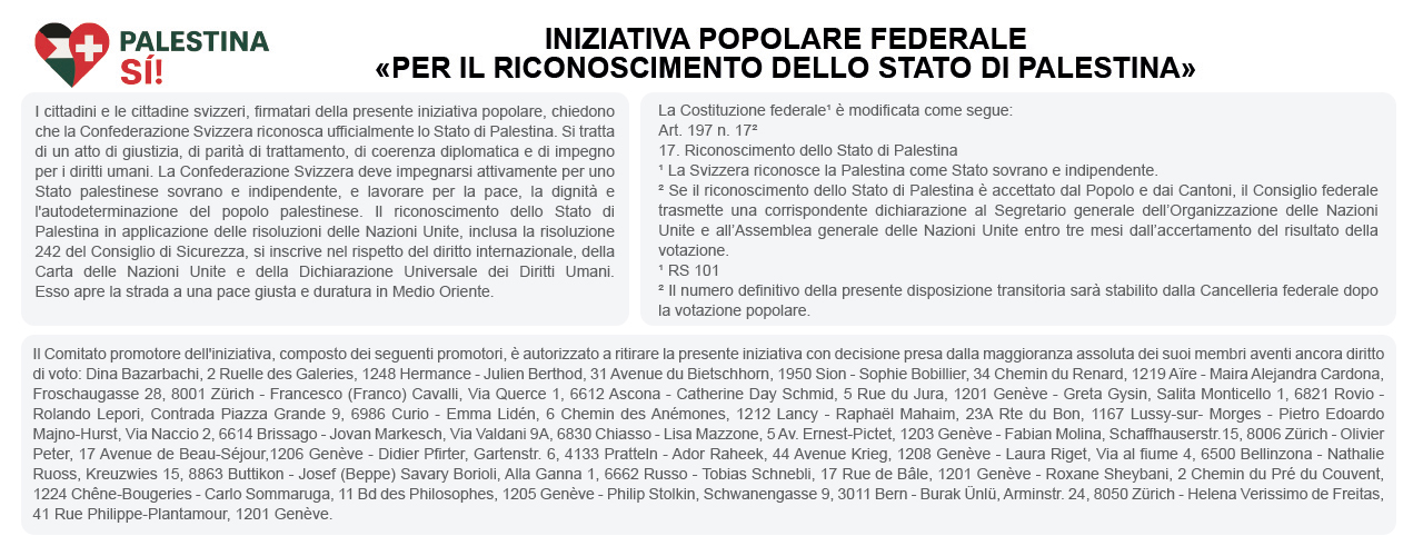 Chiediamo alla Confederazione Svizzera di riconoscere ufficialmente lo Stato di Palestina. Un gesto di giustizia, coerenza diplomatica e impegno per i diritti umani.