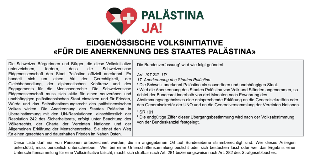 Nus dumandain da la Confederaziun svizra da renconuscher uffizialmain il Stadi da Palestina. In gest da giustia, coerenza diplomatica e engaschament per ils dretgs umans.