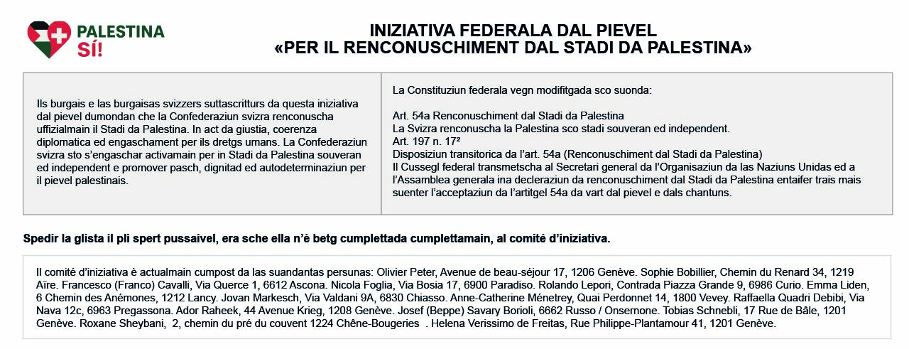 Nus essan quasi pronts per lantschar la rimnada da suttascripziuns per la Iniziativa federala dal pievel per il renconuschiment dal stadi da Palestina.