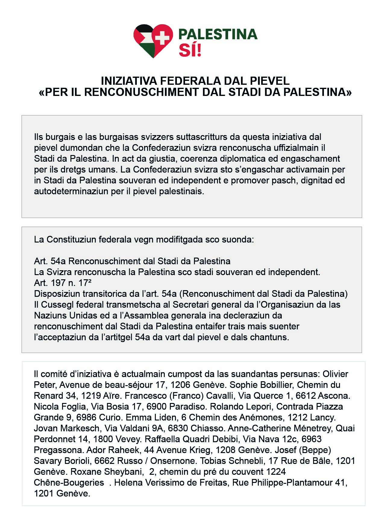 Nus dumandain da la Confederaziun svizra da renconuscher uffizialmain il Stadi da Palestina. In gest da giustia, coerenza diplomatica e engaschament per ils dretgs umans.